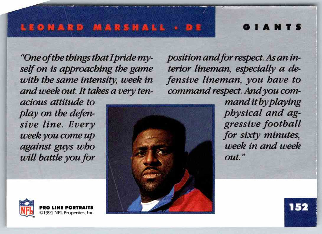 This 1991 ProLine Leonard Marshall #152 card is a must-have for any football fan! Featuring a sharp image of Marshall, the defensive end for the New York Giants, this card is perfect for any collector looking to add a piece of NFL history to their collection. With its vibrant colors and detailed design, this card is sure to make a great addition to any collection. Get your hands on this classic card, and add a piece of NFL history to your collection today!