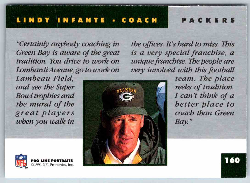 The 1991 ProLine Lindy Infante #160 is a must-have for any football fan who appreciates the legendary career of one of the NFL's most successful head coaches. This collectible card features Infante in a classic coaching stance, with the Green Bay Packers logo prominently displayed on the back. The quality construction and attention to detail make it an attractive addition to any collection. Add this item to your collection today and become the envy of your friends.