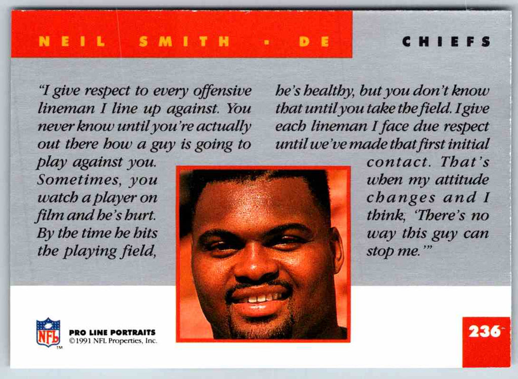 This is your chance to own a piece of NFL history. This 1991 ProLine Neil Smith #236 trading card from the Kansas City Chiefs is a must-have for any serious football collector. Featuring a vibrant full-color photo of Smith on the field, this card is sure to be the highlight of any collection. With detailed stats on the back, you can relive Smith's incredible career that included six Pro Bowl appearances and a Super Bowl victory. Add this timeless piece to your collection today!