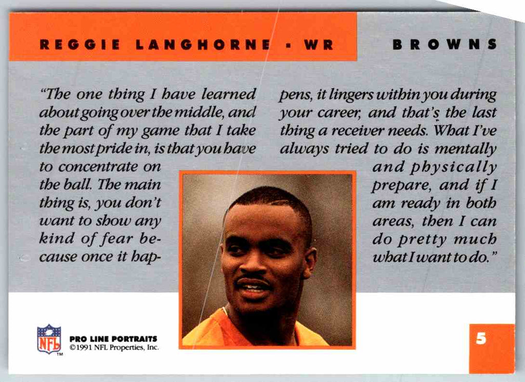 This 1991 ProLine Reggie Langhorne #5 card celebrates the career of a wide receiver who made a name for himself during the 1980s and early 90s. Langhorne played 11 seasons in the NFL, mostly with the Cleveland Browns and the Philadelphia Eagles. The card features a detailed image of Langhorne in his playing days, and is a great collectible item for any NFL fan. Add to your collection today and be sure to check out other ProLine cards from the same era!