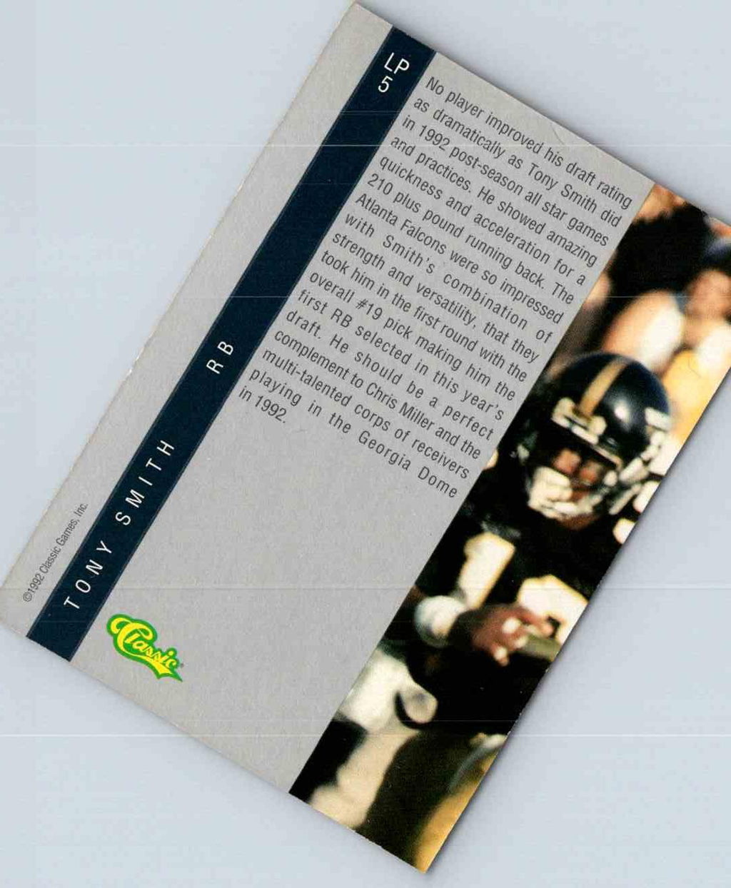 This 1991 ProLine Tony Smith #LP5 card is an essential for any serious collector. Featuring a beautiful full-bleed photo of the NFL running back in his signature white and blue Philadelphia Eagles uniform, this card is sure to make a great addition to any collection. A gold foil stamp of Smith's name and team logo add a touch of elegance to the card, and the back features a detailed biography and career stats. Get your hands on this timeless piece of NFL history, and bring your collection up to the next level!