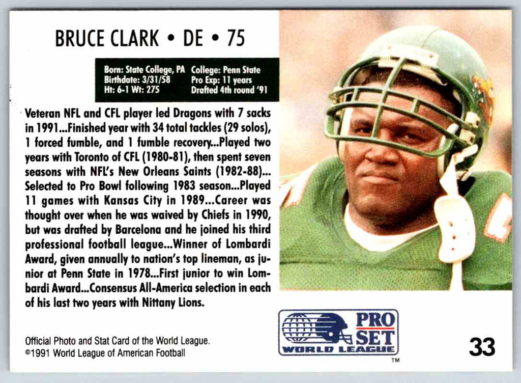 This 1991 ProSet World League Bruce Clark #33 card is a great addition to any football card collection. With a vibrant blue and yellow background, the card features a close-up of Clark in his blue and white uniform. The card is in mint condition and contains all the stats and career highlights of the former NFL linebacker. It's the perfect way to commemorate one of the most talented and respected players in football history. Add this Bruce Clark card to your collection today!