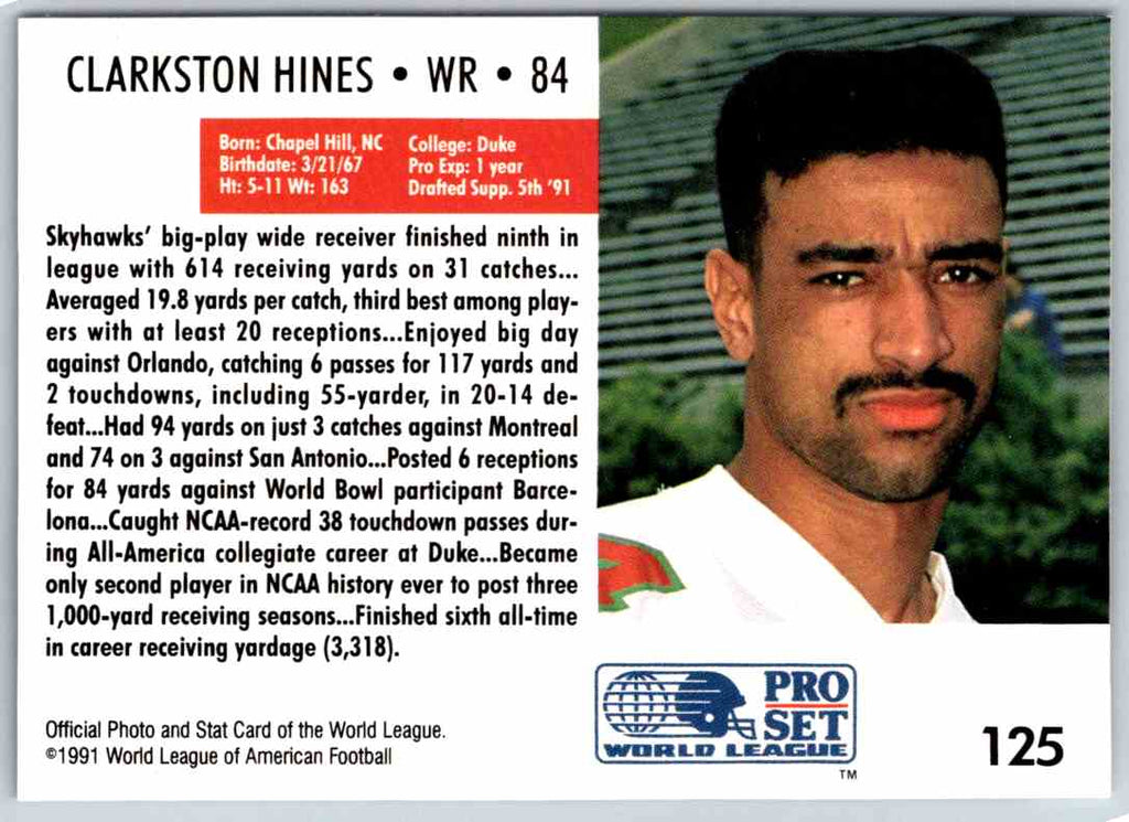 This 1991 Proset World League card of Clarkston Hines is an amazing piece of sports memorabilia. Featuring a beautiful glossy image of Hines in his full uniform, this card is sure to be a hit with any collector or fan. Its classic design will stand the test of time, and its sturdy construction will ensure it lasts for years to come. Get your hands on this piece of history today!