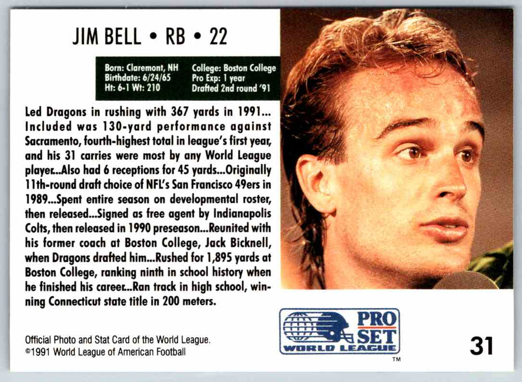 This 1991 Proset World League Jim Bell #31 card captures the essence of a major league player! It features a classic, full-color glossy photo of Jim Bell in his uniform, with a sharp and vibrant appearance that has withstood the test of time. The back of the card includes stats and a detailed biography of Bell, making it the perfect piece of memorabilia for any baseball fan. Add this card to your collection today and remember the greats of the game!
