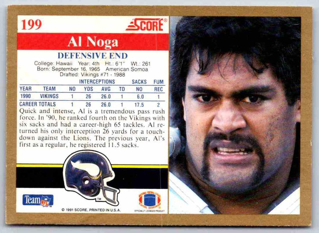 This 1991 Score Al Noga #199 card is a must-have for any football memorabilia collector. With a professional grade card stock, intricate details, and vibrant colors, this card showcases Noga's signature style and intensity. Featuring a detailed action shot of the Minnesota Vikings defensive lineman, this card is sure to stand out in any collection. A perfect addition to any football memorabilia collection, this card is a must-have for any true fan.