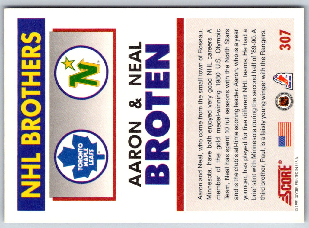 This 1991 Score American Aaron Broten/Neal Broten #307 card is a must-have for hockey card collectors. Featuring a classic image of the Broten brothers, it captures the powerful bond between them and their shared passion for the game. With the Minnesota North Stars and Toronto Maple Leafs logos, this card is sure to stir up some nostalgia for hockey fans. It's a great way to remember one of the most legendary pairs of hockey players in the history of the NHL. Add this card to your collection today!