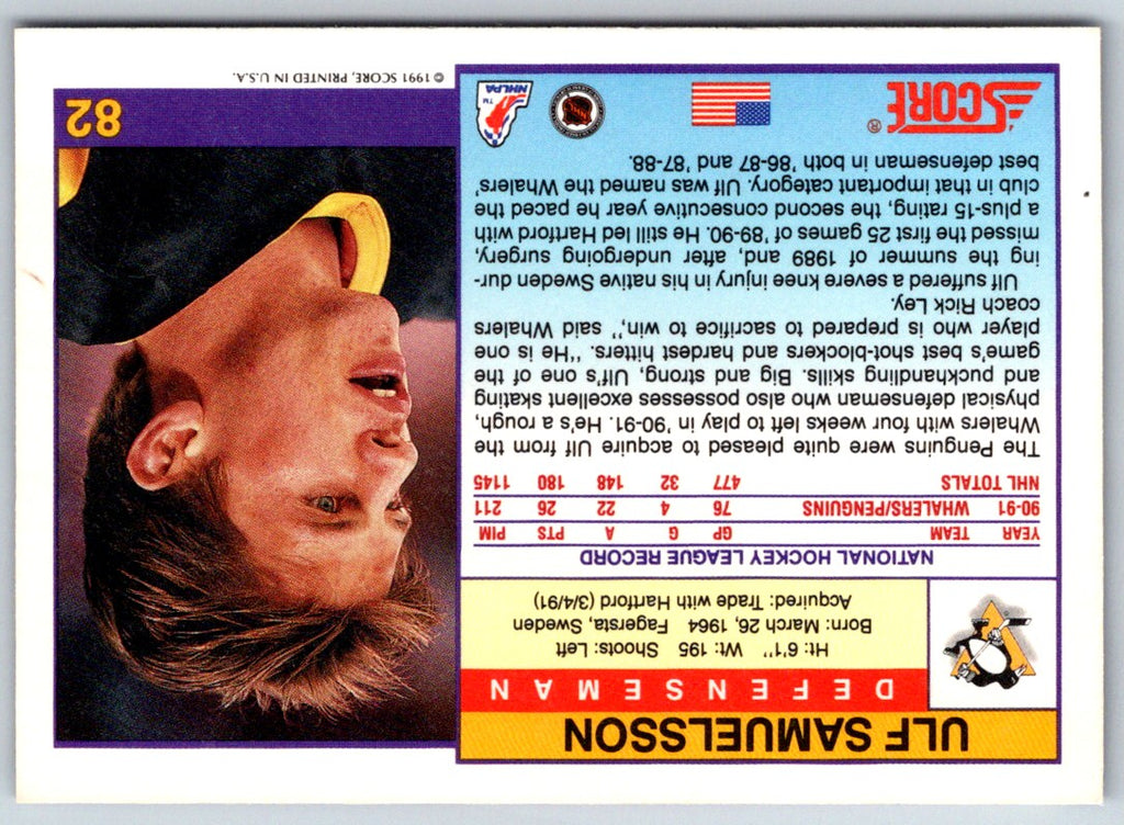 1991 Score American Ulf Samuelsson #82 Pittsburgh Penguins is a must-have for any hockey fan. This collectible card is perfect for any hockey card enthusiast looking to add a piece of history to their collection. Showcasing a classic image of Samuelsson in his Penguins uniform, this card also includes a detailed summary of his career and stats. With a glossy finish and sharp colors, this card is sure to be a hit among hockey collectors. Add this collectible card to your collection today and honor a true hockey legend.