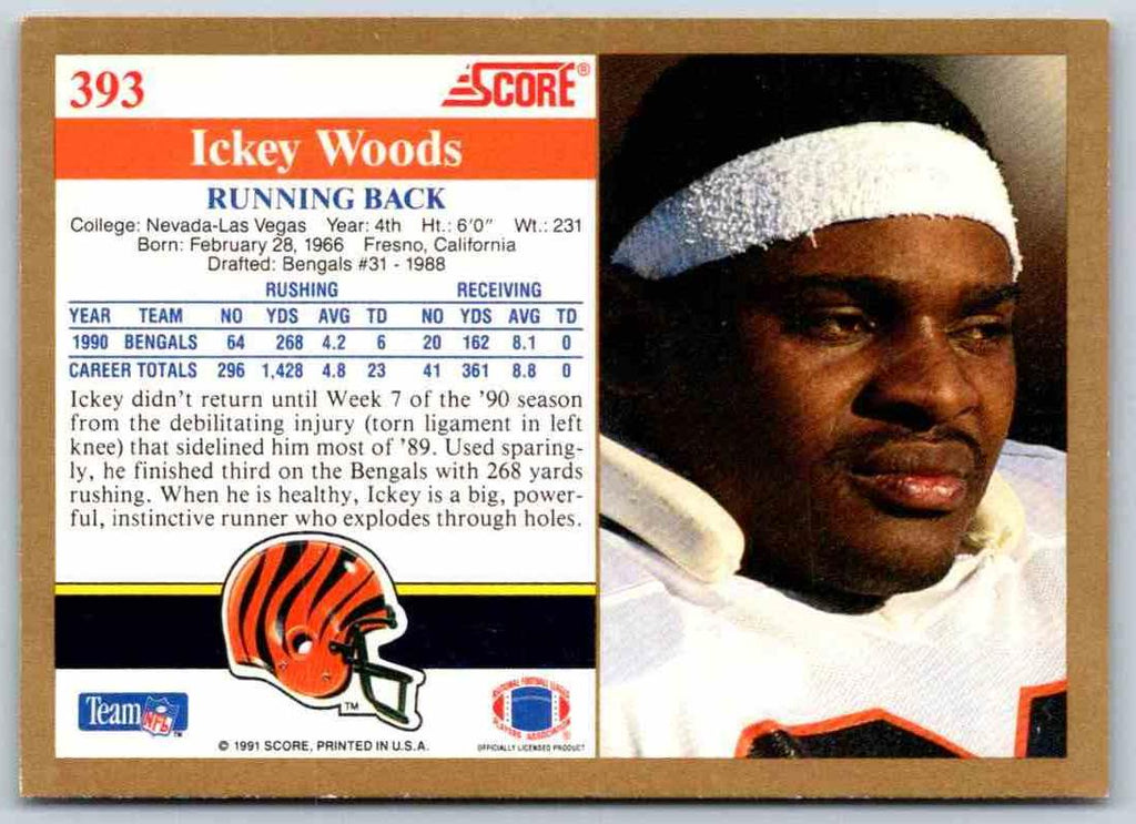 This 1991 Score Ickey Woods #393 card is the perfect addition to any football fan's collection. Featuring a full-color image of Woods during a touchdown dance, this card celebrates the Cincinnati Bengals running back's peak performance during the 1988 and 1989 seasons. The card back also includes his detailed stats and a brief biography. A must-have for any Ickey Woods fan!