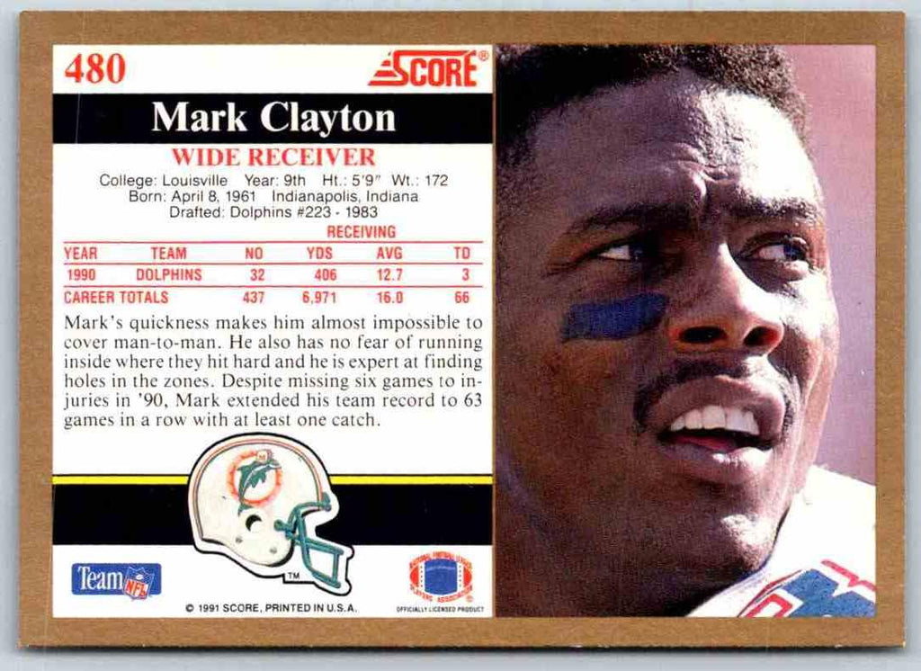 This 1991 Score Mark Clayton #480 card is the perfect way to add a Miami Dolphins legend to your collection. Clayton was a star wide receiver for the Dolphins from 1983-1992 and was inducted into the Pro Football Hall of Fame in 2011. This card features a crisp color photo of Clayton in action, as well as his career statistics and vital information. It also includes a unique hologram technology that ensures the authenticity of the card. Add this piece of Dolphins history to your collection today!