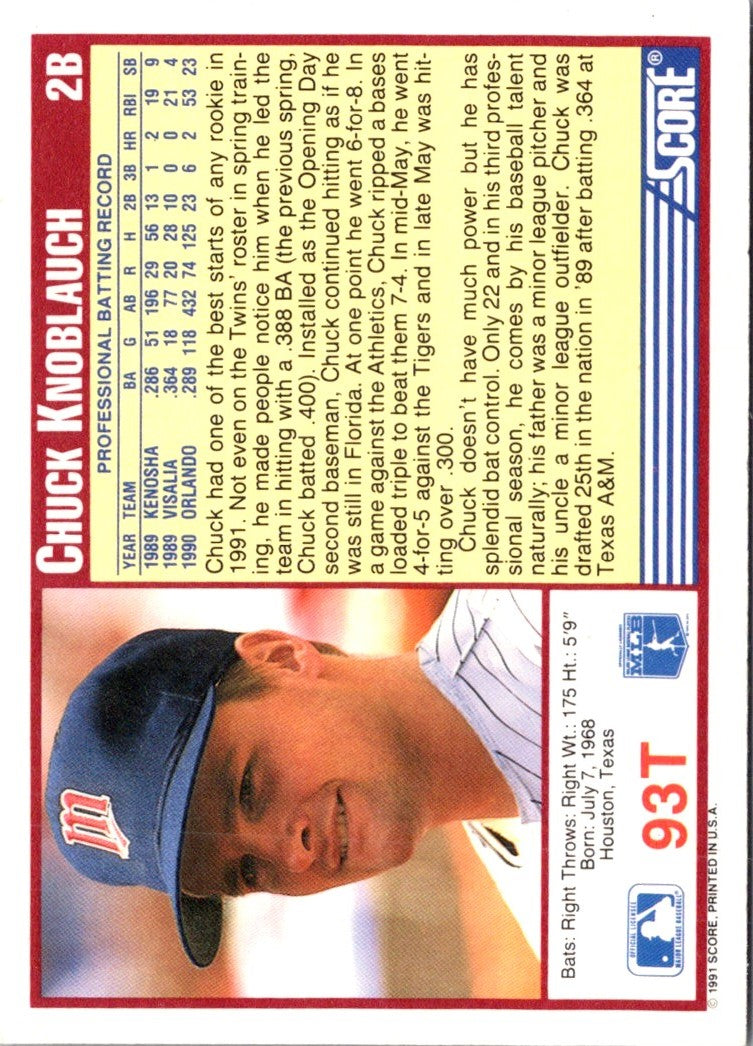 Description: 1991 Score Rookie & Traded Chuck Knoblauch #93T