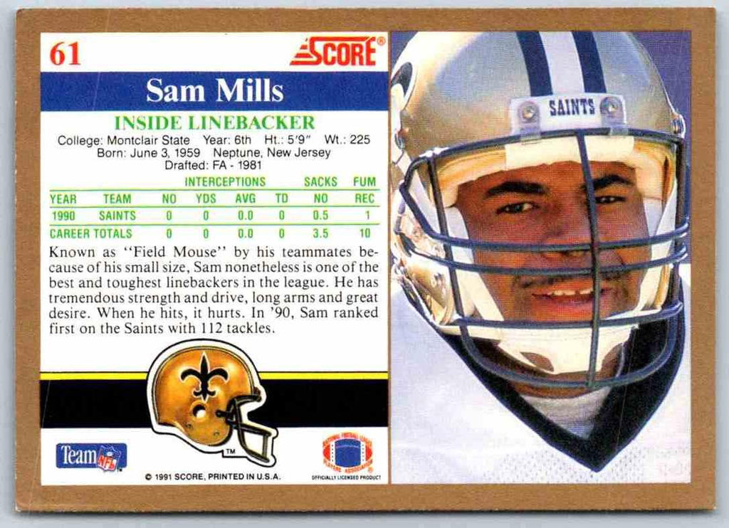 This 1991 Score Sam Mills #61 card is a great addition to any sports memorabilia collection. The vibrant colors and sharp corners make the card stand out in any collection. The front of the card features Sam Mills in his Carolina Panthers uniform. The back of the card includes Mills' stats and vital information about his career. It is an ideal collectible for any fan of the Carolina Panthers or Sam Mills. Add this card to your collection today and show your support for one of the greatest players to ever step on the field.