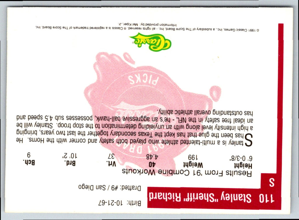 This 1991 Score Stanley Richard #586 San Diego Chargers card is the perfect piece of memorabilia for any die-hard Chargers fan. Featuring a detailed image of the legendary running back on the front, and a full list of his impressive stats on the back, this card is a must-have for any collector. With its vivid colors and crisp details, this card is sure to be a centerpiece of any collection. Get your hands on this classic card today and show off your Chargers pride!
