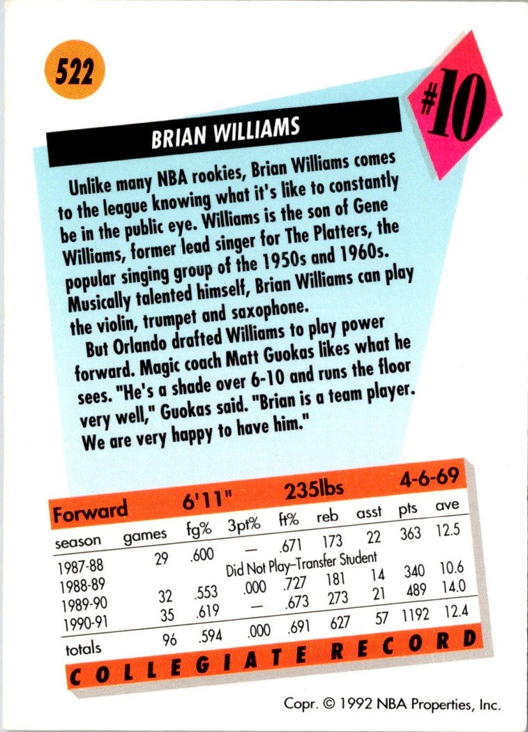Description: 1991 SkyBox Brian Williams #522 Rookie