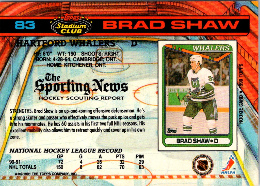 Brad Shaw was a mainstay on the Hartford Whalers' blue line from 1989 to 1996. Show your support of the legendary Whalers with this 1991 Stadium Club card of the veteran defenseman. The card features a crisp image of Shaw in his classic Whalers uniform and provides a great opportunity to commemorate his time with the team. Add this piece of hockey history to your collection today!