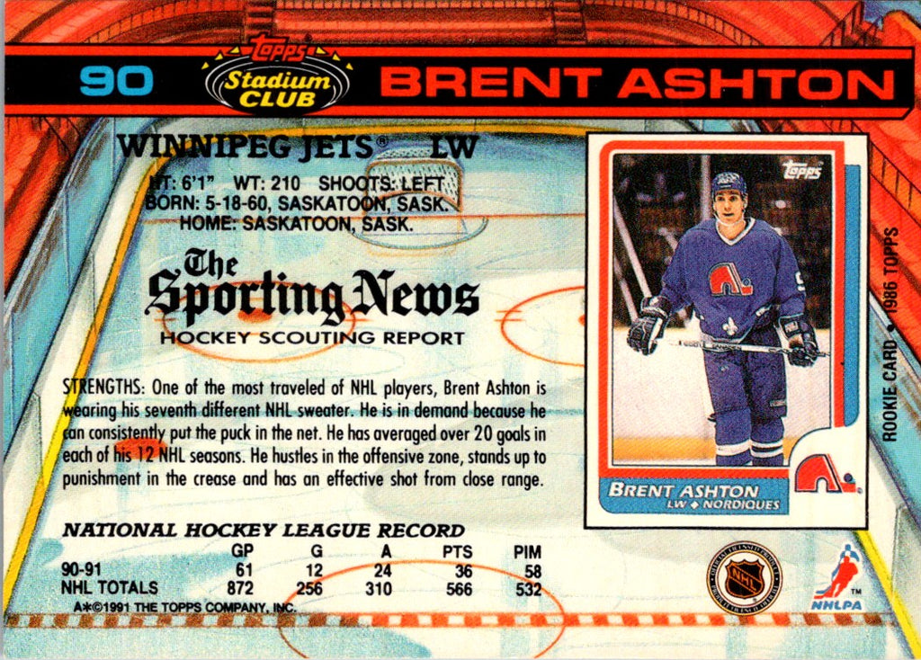 This 1991 Stadium Club Brent Ashton #90 is a must-have item for any Winnipeg Jets fan. Featuring bold and vibrant colors, this card is sure to make an impact in any collection. The card showcases Ashton's signature style, with a classic Jets uniform and a determined expression that will never go out of style. With its high quality construction and sharp detail, this card is an excellent addition to any Jets fan's collection. Don't miss out on this classic card and pick up your own today!