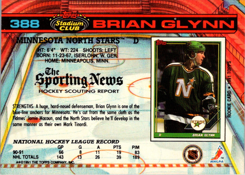 This 1991 Stadium Club Brian Glynn #388 Minnesota North Stars card is a must-have for any hockey collector. Featuring a crisp image of Glynn in his North Stars uniform, the card is a great addition to any collection. As one of the top-tier members of the Minnesota North Stars, Glynn was a key member of the team that reached the Stanley Cup Finals in 1991. With this card, you can honor the legacy of Brian Glynn and the Minnesota North Stars. Add this card to your collection today and celebrate the achievements of one of the NHL's most beloved teams.