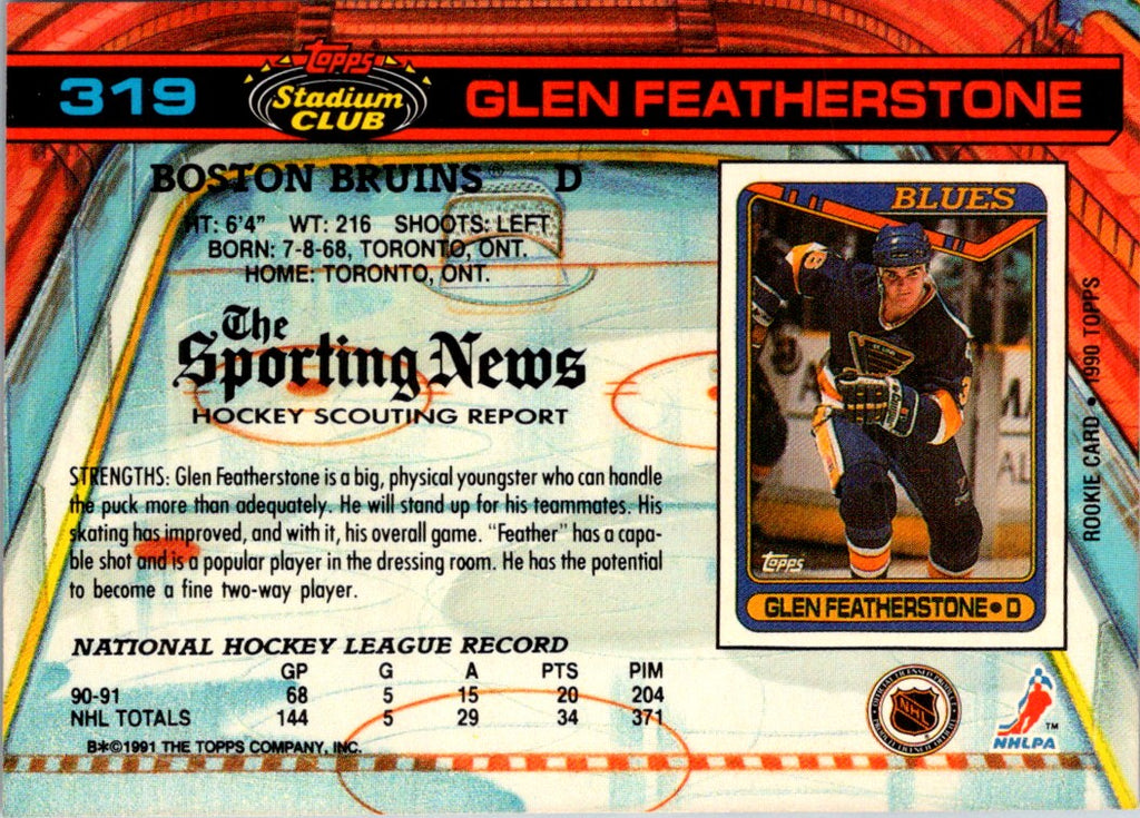 This 1991 Stadium Club Glen Featherstone #319 St. Louis Blues hockey card is a great addition to any collection. Featuring Featherstone in his blue and yellow Blues jersey, this card shows the talented defenseman in action. With bright colors and sharp corners, this card is in excellent condition and will make a great addition to any hockey card enthusiast's collection.