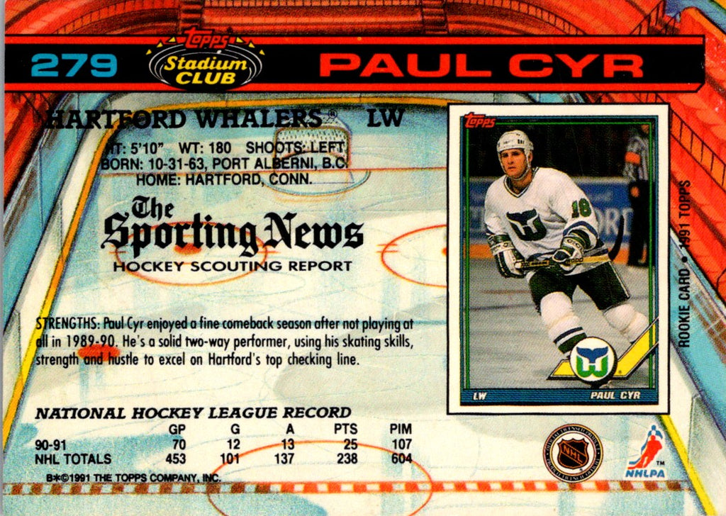 This 1991 Stadium Club Paul Cyr #279 card featuring the Hartford Whalers is a great piece of hockey history. An essential for any Whalers fan, this card would be perfect for any collection. Featuring a sharp and vibrant image of Paul Cyr in action, this card is sure to make a great addition to any hockey collection. With sharp corners and edges, this card is in great condition and will be a great addition to any collection.