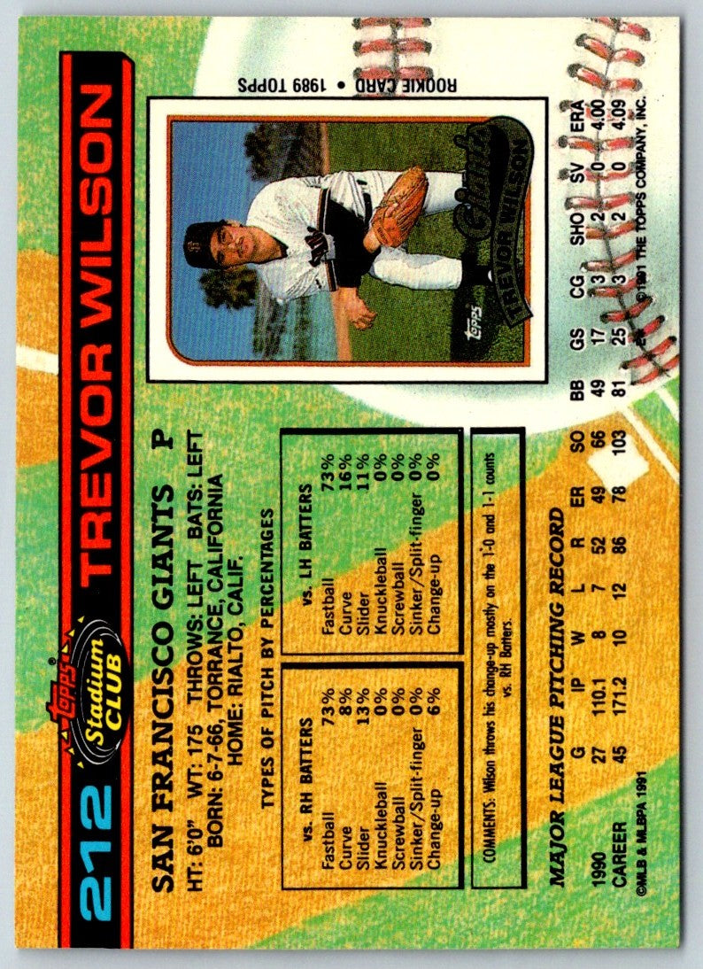 This 1991 Stadium Club Trevor Wilson #212 San Francisco Giants card is an essential for any collector. Showcasing a classic photo of the pitcher in a Giants uniform, the card also features an action shot of him delivering a pitch. This card would make a great addition to your collection and is sure to increase in value as time goes on.