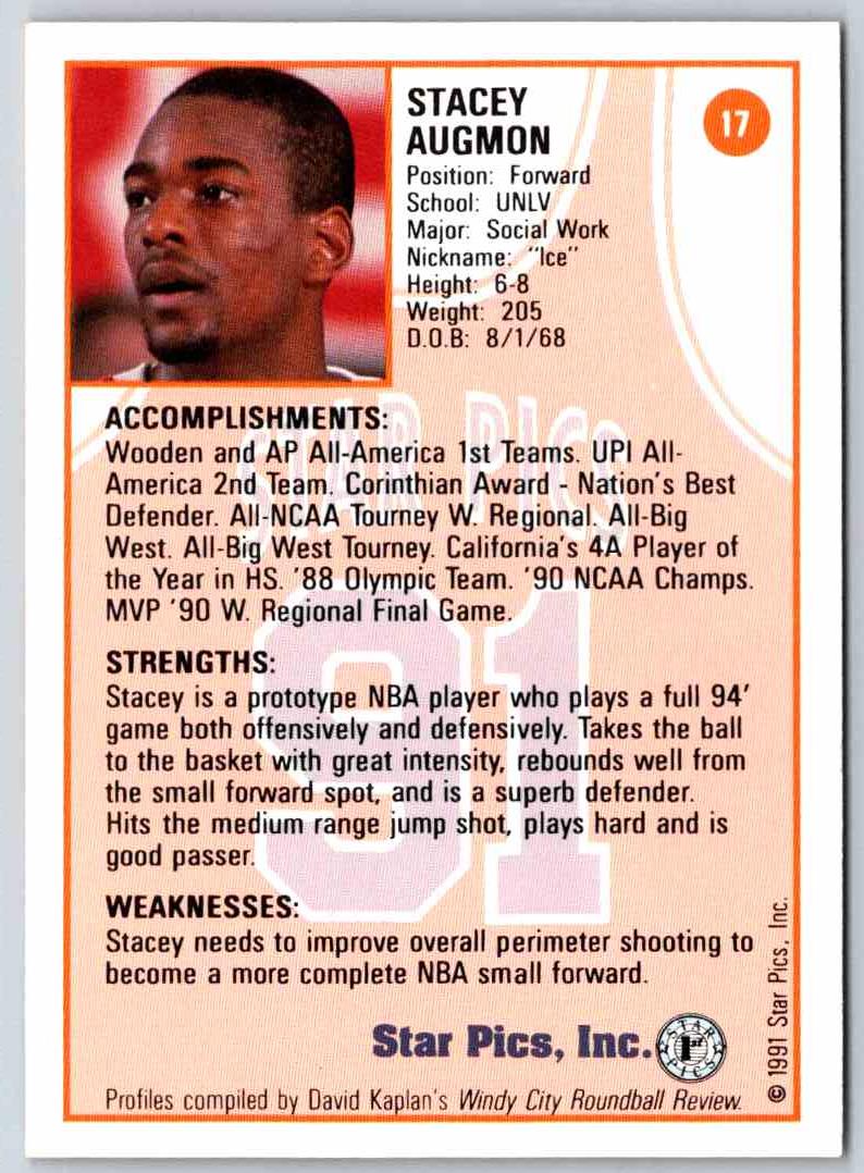 This 1991 Star Pics Stacey Augmon #17 card is a must-have collectible for any fan of the former NBA star. Featuring a vibrant, full-color image of Stacey Augmon in action, this card is perfect for any sports memorabilia enthusiast. It will bring years of enjoyment and appreciation to your collection. The card is in excellent condition and features bold, sharp edges and corners. A collectible to be cherished for years to come.
