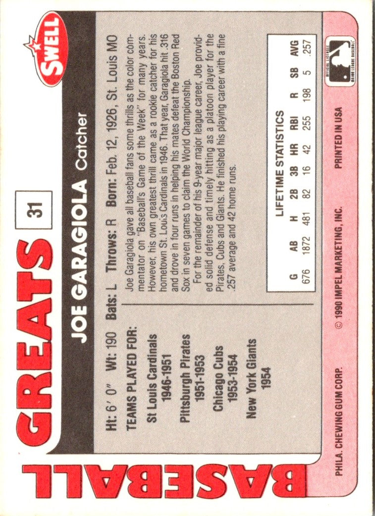 This 1991 Swell Baseball Greats Joe Garagiola #31 St. Louis Cardinals card is the perfect addition to any baseball fan's collection. Featuring an image of Joe Garagiola in his Cardinals uniform, this card is sure to be a great conversation starter! This card is from the Swell Series which means it is of the highest quality. You won't want to miss out on this amazing piece of baseball history. Collect it today!