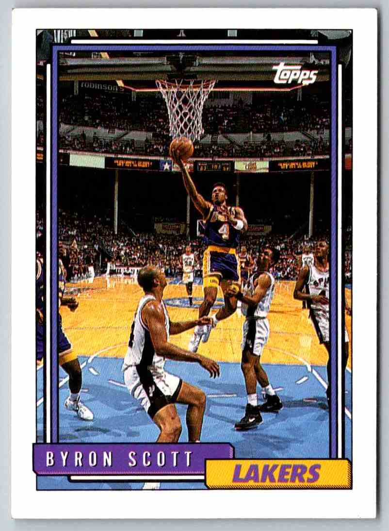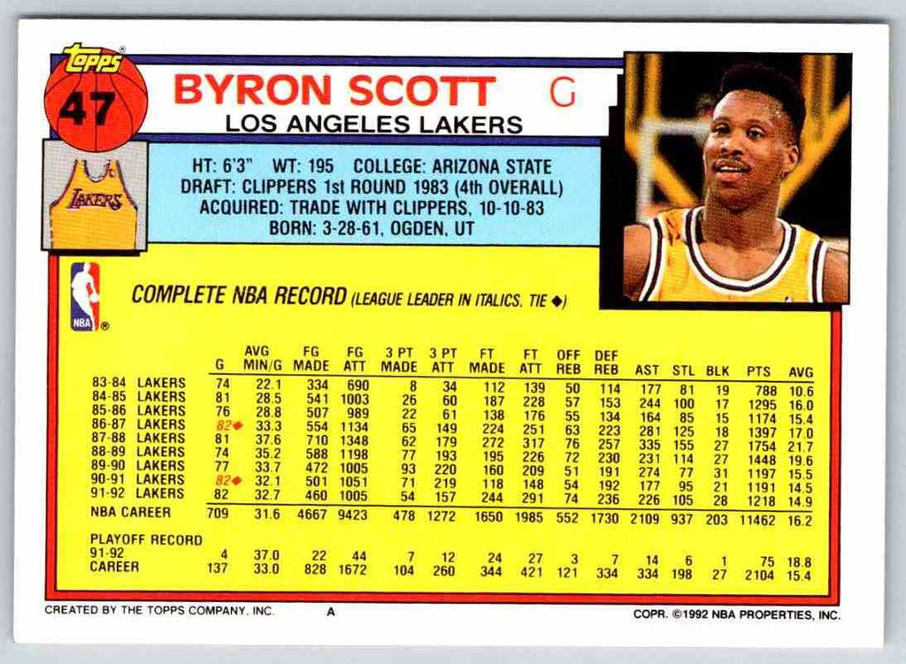 This 1991 Topps Bryon Scott trading card features a crisp, vibrant image of the legendary NBA guard in action for the New Jersey Nets. The card, number 47 in the set, captures Scott in the middle of a jump shot, with a blue Nets jersey and signature headband. The reverse side of the card lists his career stats and highlights. Add this piece of NBA history to your collection today!