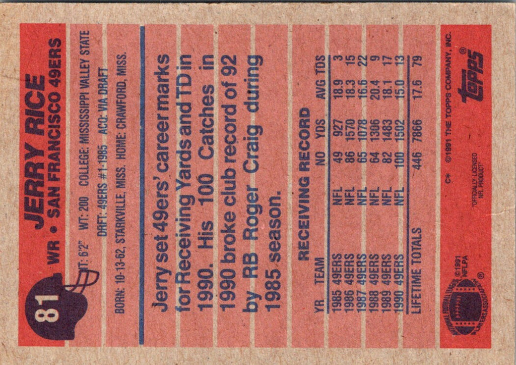 This 1991 Topps Jerry Rice #81 San Francisco 49ers card is the perfect addition to any 49ers fan's collection. With its vibrant colors and classic design, it's a true classic that will adorn any wall. The card features a portrait of Rice in his classic 49ers uniform, with a background of the team's logo and colors. The card also includes all of Rice's stats from the 1991 season, so you can relive all of his incredible accomplishments from that year. Add this classic card to your collection, and cherish it as a reminder of one of the greatest players of all time.