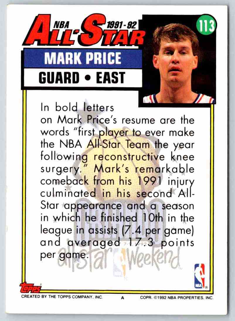 This 1991 Topps Mark Price #113 is a must-have for any basketball fan! This card features an action shot of the renowned shooting guard in his prime, with vibrant colors and crisp details. The back of the card includes a detailed biography and career stats, so you can learn more about this iconic player. This card is a great addition to any collection, and will look great framed and displayed!