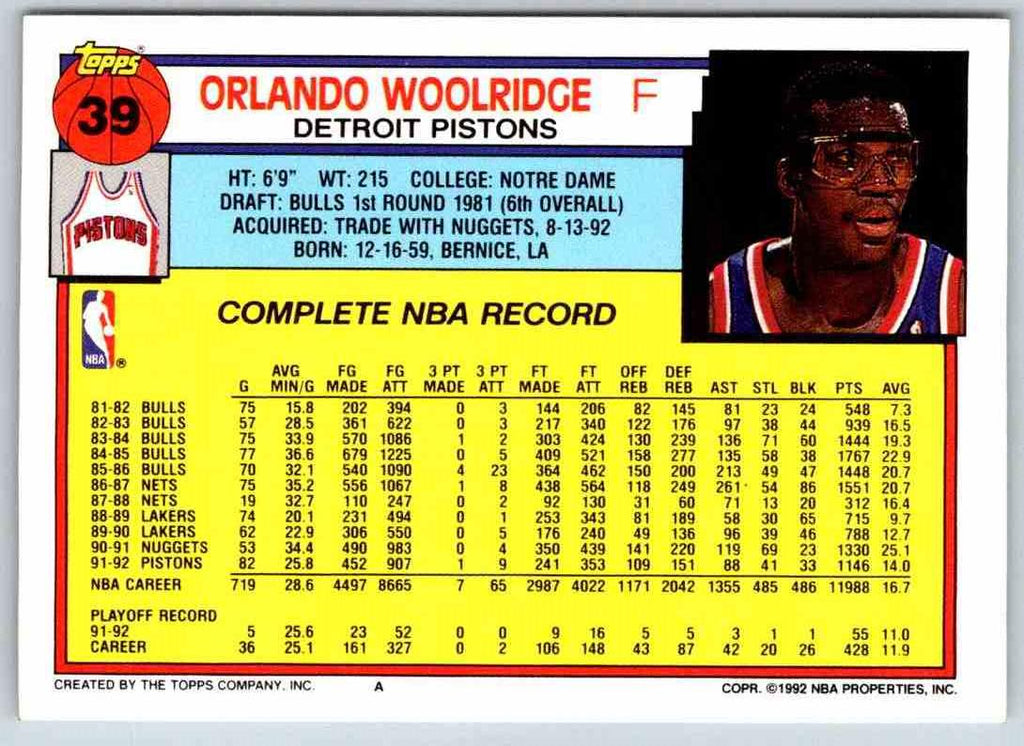 This 1991 Topps Orlando Woolridge #39 card features a portrait of the star NBA forward in his Chicago Bulls uniform. His stats are displayed on the back of the card, including his 12.9 points per game average for the 1990-91 season. This card is a must-have for any Bulls fan or basketball card collector. It's a great way to commemorate Orlando Woolridge's brilliant career, from the All-Star Game in 1984 to his championship-winning season in 1991. Get your hands on this classic card today and add it to your collection!
