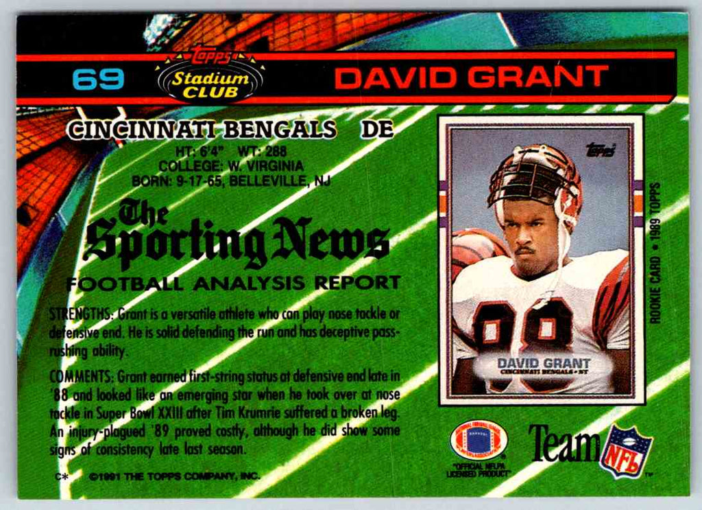 This 1991 Topps Stadium Club Football David Grant #69 card is a must-have for any football fan! Featuring a crisp and vibrant image of the legendary football player, this card is sure to be the highlight of any collection. The card is professionally printed on durable card stock and is in near-mint condition. Perfect for any fan of the classic game, this card is sure to be a perfect addition to your collection. Get your hands on this classic piece of football history today!