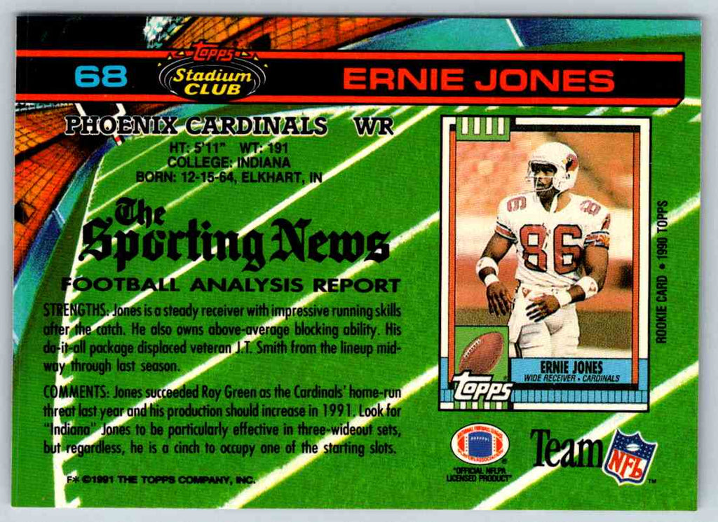 This 1991 Topps Stadium Club Football Ernie Jones #68 card is an excellent addition to any collector's portfolio. Showcasing a full-colour, glossy image of Ernie Jones, this card is sure to bring back memories of the gridiron. With a crisp and clean design, this card is the perfect way to show your admiration for the former running back. Whether you're a fan of the game or a collector, this card is the perfect way to show your appreciation for the great Ernie Jones. Don't miss this chance to add this unique card to your collection.