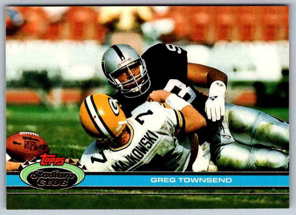 Introducing the 1991 Topps Stadium Club Football Greg Townsend #304! This iconic card celebrates the two-time Pro Bowl defensive end who played for the Los Angeles Raiders and Philadelphia Eagles during his NFL career. Featuring a crisp, full-color action shot of Townsend in his Philadelphia Eagles uniform, this card is a must-have for any football fan. Add it to your collection today and relish in the memories of one of the greatest defensive ends of all time.
