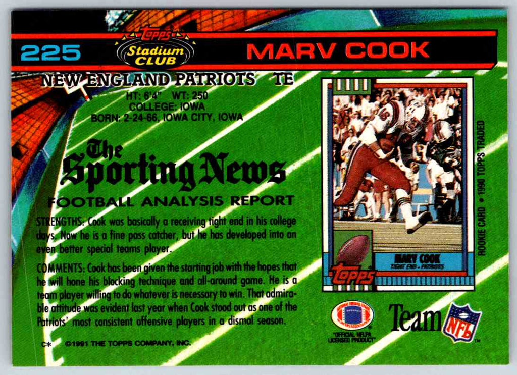 This 1991 Topps Stadium Club Football Marv Cook #225 card is a valuable addition to any football card collection! It features a classic black and white headshot of Marv Cook, a former New England Patriots and Chicago Bears tight end. This card has been professionally graded a "Near Mint/Mint" condition by Beckett, the leading authority in sports card grading. This card is a must have for any football card collector or fan of Marv Cook.