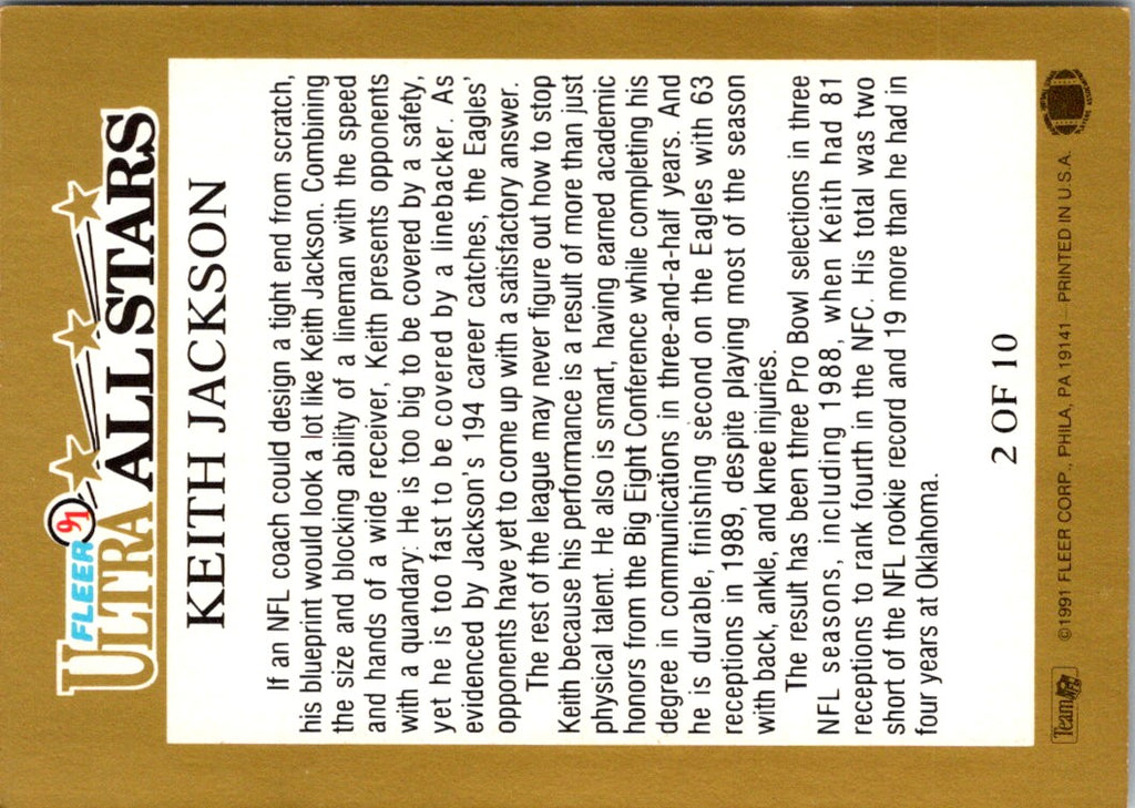 This 1991 Ultra All Stars Keith Jackson #2 Philadelphia Eagles card is the perfect addition to any football fan's collection. Featuring a sharp, glossy image of Jackson, it accurately captures the style and grace of his Hall of Fame career. The card also boasts an array of stats and highlights from his time on the Eagles, providing a unique look into the career of one of the greatest players of all time. With its excellent condition and vivid artwork, this card is sure to be a treasured addition to any fan's collection.