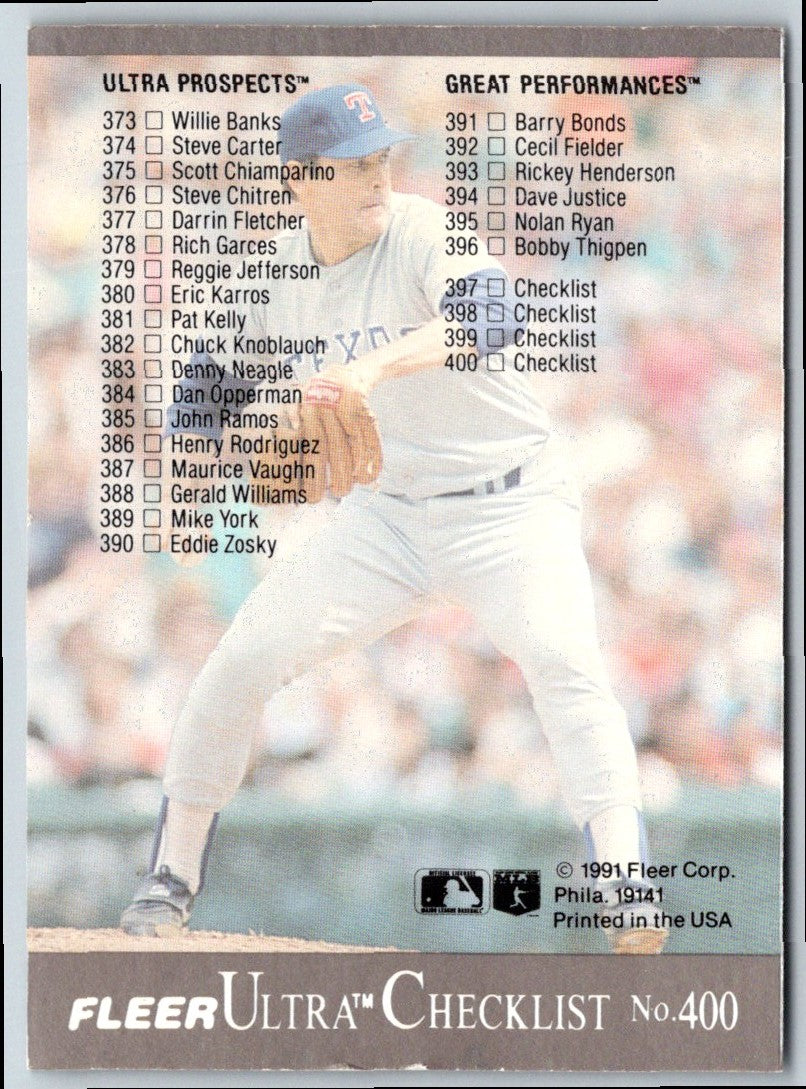 This 1991 Ultra Checklist 314-400 is a must-have for baseball card collectors! This set includes cards from the San Francisco Giants, Seattle Mariners, Texas Rangers, and Toronto Blue Jays. Each card is printed on premium card stock and features beautiful full-color images of your favorite players. This set also includes valuable stats and information to help you keep track of your favorite players. With this checklist, you can easily track your collection and track the value of your cards. Don't miss out on this amazing set!