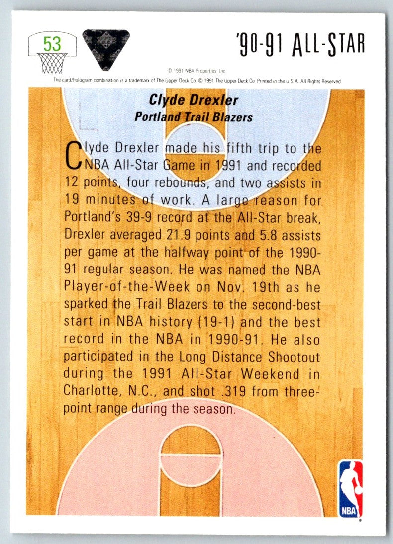 This 1991 Upper Deck Clyde Drexler #53 Portland Trail Blazers card is the perfect addition to any basketball memorabilia collection. Featuring a stunning portrait of the legendary Blazer on the front, this card is sure to turn heads. The back side of the card has statistics and highlights of Drexler's illustrious career, including his 10 All-Star game appearances and his time as a member of the 1992 USA Basketball Dream Team. This card is a must-have for any Clyde Drexler fan and makes a great gift for a basketball enthusiast. Add this iconic card to your collection today!