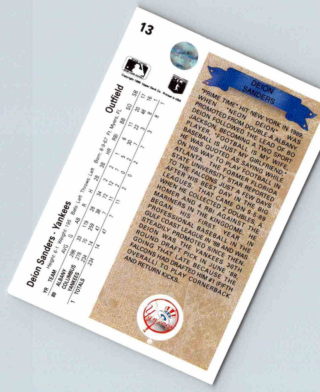 The 1991 Upper Deck Deion Sanders #13 card is a great addition to any sports card collection. This card features an action shot of the legendary football and baseball player, Deion Sanders. He is pictured in his iconic uniform and helmet, ready to make a big play. The card has great artwork, vibrant colors, and amazing details that make it a must-have for any Deion Sanders fan. It is the perfect way to honor one of the most iconic athletes of all time. Add this card to your sports card collection today and show off your love of Deion Sanders.