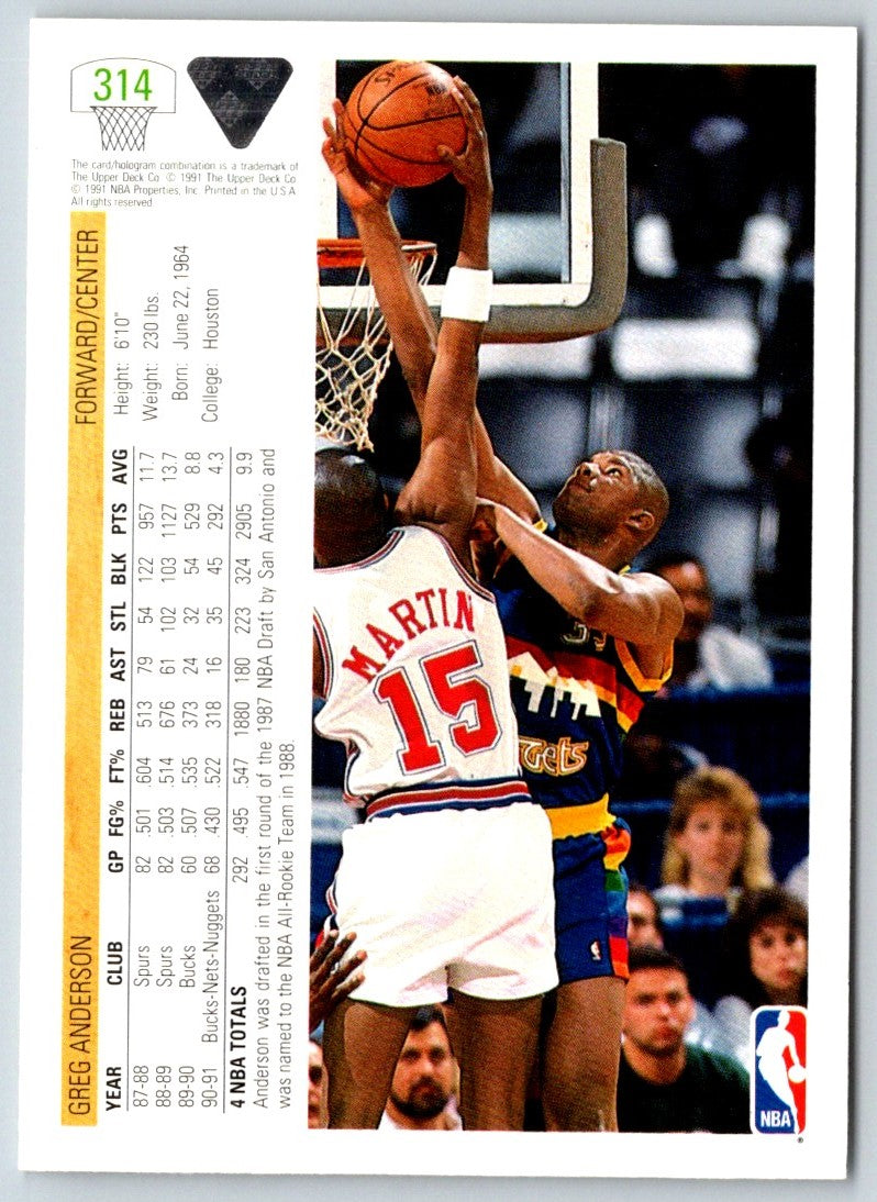 This 1991 Upper Deck Greg Anderson #314 Denver Nuggets card is a must-have for any basketball card collector. Featuring the power forward in his signature Nuggets jersey, this card captures a moment of Anderson on the court. It also features stats and team logo, making it an ideal addition to any basketball card collection. Get your hands on this highly sought-after card today and add it to your collection!