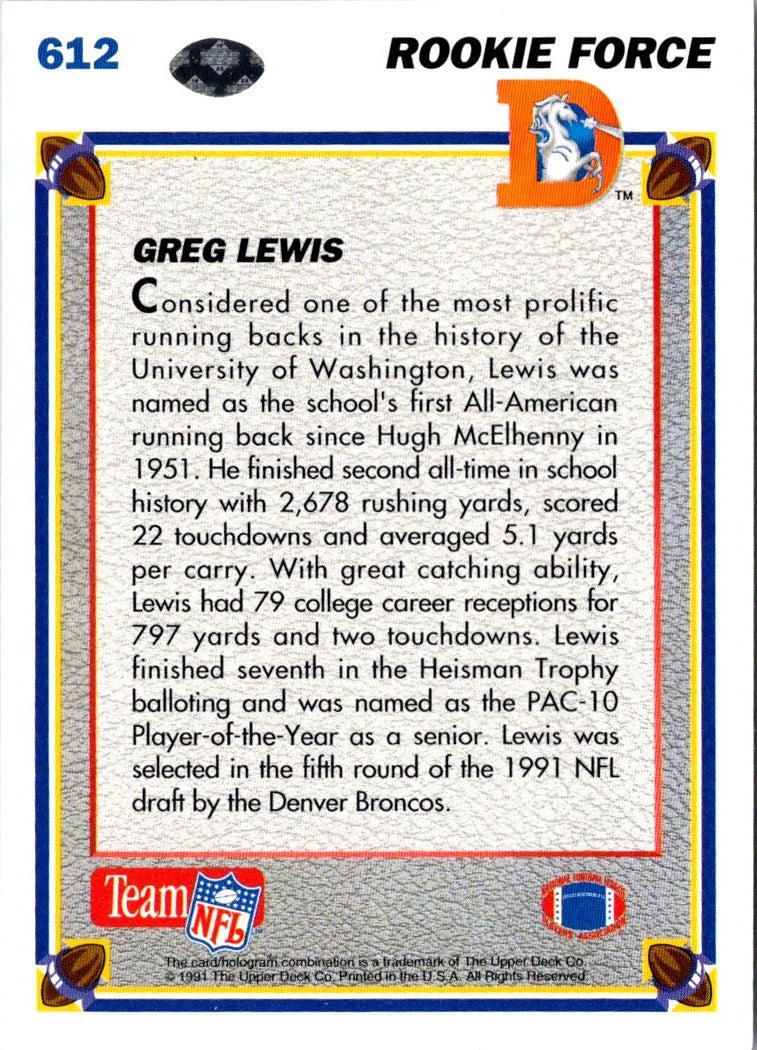 Description: 1991 Upper Deck Greg Lewis #612