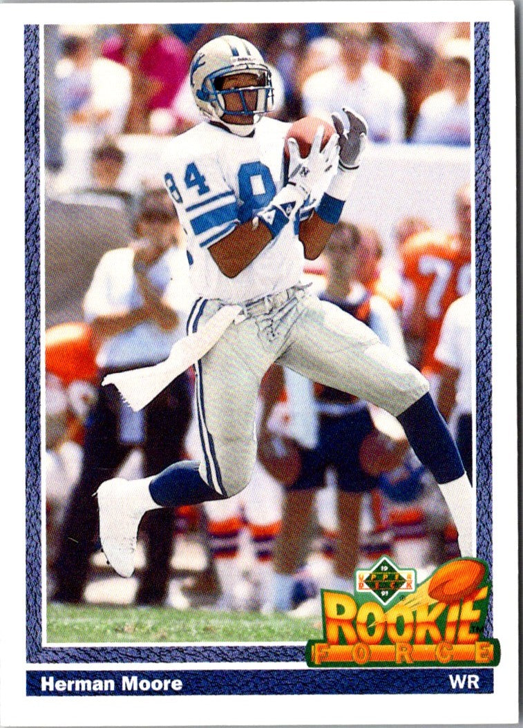 This 1991 Upper Deck Herman Moore #639Detroit Lions card is a must-have for any Detroit Lions fan. This card features a great image of Herman Moore in his iconic Lions uniform. The card has a glossy finish and is in near-mint condition, providing a great way to show your support for the Lions. The rich coloring and sturdy cardstock make this a great collectible to add to your collection. So don't miss out on this great card and order yours today!