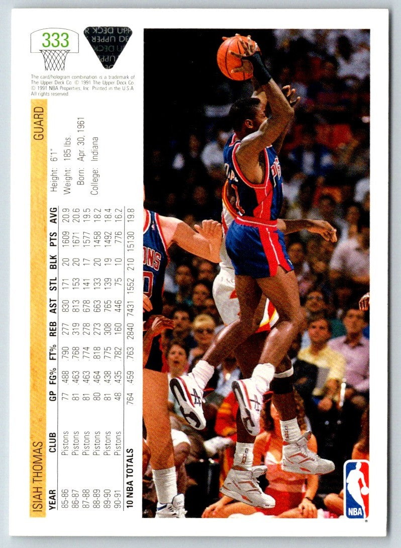 This 1991 Upper Deck Isiah Thomas #333 Detroit Pistons card is the perfect addition to any basketball fan's collection. Featuring a full-color action shot of Isiah Thomas in his Pistons jersey and a bright, bold design, this card is sure to stand out! With a glossy finish and crisp edges, this card is sure to become a treasured part of your collection. Add this iconic card to your collection and commemorate one of the greatest players in NBA history!