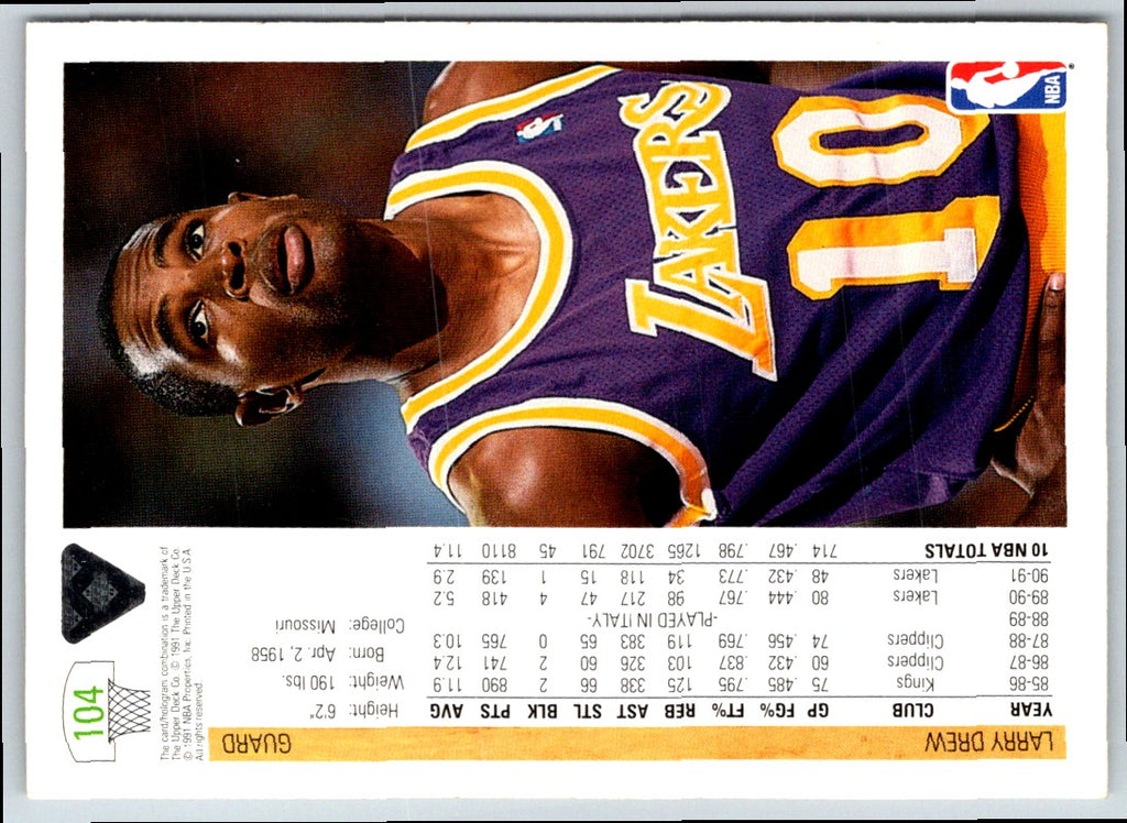 The 1991 Upper Deck Larry Drew #104 Los Angeles Lakers card is sure to be the centerpiece of any basketball card collection. This card features a full-color portrait of Larry Drew in his classic Lakers uniform. The card also features Drew's stats, including points, assists, rebounds, and steals. It's the perfect way to remember one of the greatest point guards of all time. Add this classic card to your collection today and enjoy the nostalgia!