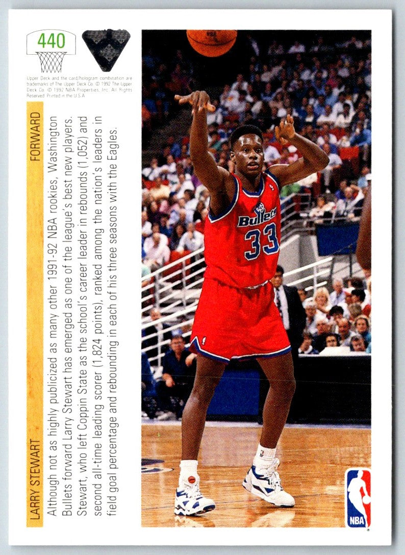 This 1991 Upper Deck Larry Stewart #440 Washington Bullets card is the perfect addition to your basketball card collection. The card features a vibrant photo of Larry Stewart in his Washington Bullets uniform, with a bright yellow background. The card is in mint condition, and the sharp corners and clean edges make it a must-have for any basketball card enthusiast. The back of the card contains detailed information about Stewart's career, including his statistics, awards, and accomplishments. Add this card to your collection and relive one of the greatest careers in Washington Bullets history!