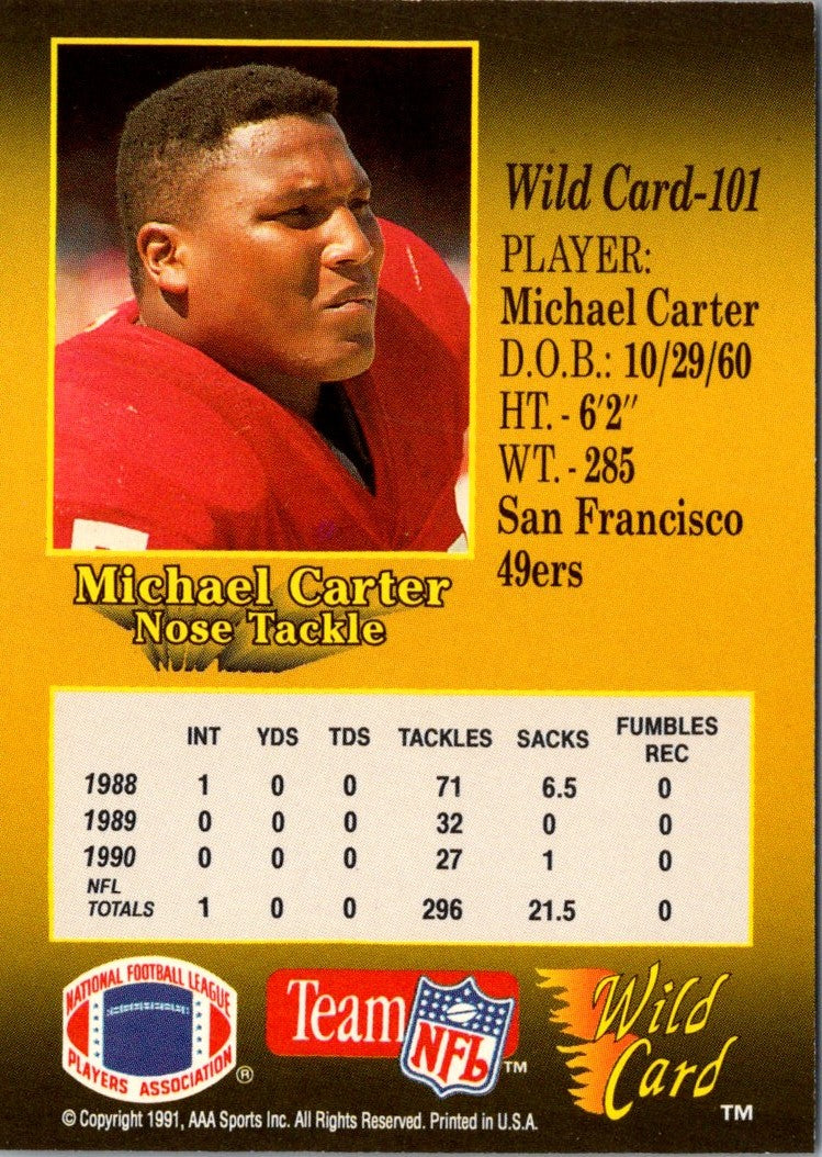This 1991 Wild Card Michael Carter #101 San Francisco 49ers collectible is a must-have for any true 49ers fan! This piece of sports memorabilia features a full-color action photo of Michael Carter in his iconic 49ers uniform, with the team logo and a white border to really make the photo pop. This collectible is a great way to celebrate the 49ers legendary success and history, while also honoring one of their greatest players. Add this item to your collection today and show your team pride!