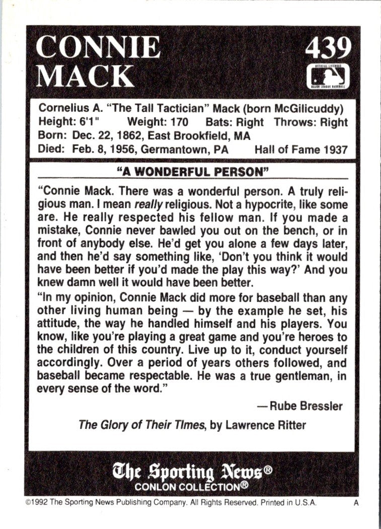 The 1992 Conlon Collection TSN Connie Mack #439 Philadelphia Athletics is a must-have for any collector. This card features an iconic image of the legendary manager and Hall of Famer looking out from the dugout. The card is printed on glossy stock with a clean and crisp design. The back of the card contains a biography of Connie Mack, highlighting his remarkable career and many accomplishments. This card is a great addition to any collection and serves as a reminder of the remarkable legacy left by the man they called "The Grand Old Man of Baseball."