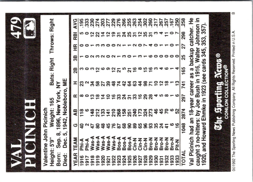 Description: 1992 Conlon Collection TSN Val Picinich #479