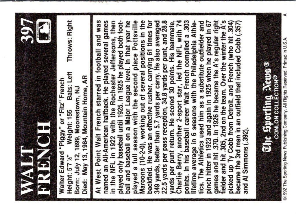 This 1992 Conlon Collection TSN Walter French #397 Philadelphia Athletics card is a must-have for any baseball card collector! The card features Walter French in his Athletics uniform, along with detailed statistics from his professional baseball career. The card was printed on glossy, high-quality cardstock and features a vivid full-color image. This card is a great way to commemorate the career of a Hall of Famer and bring your collection to life!