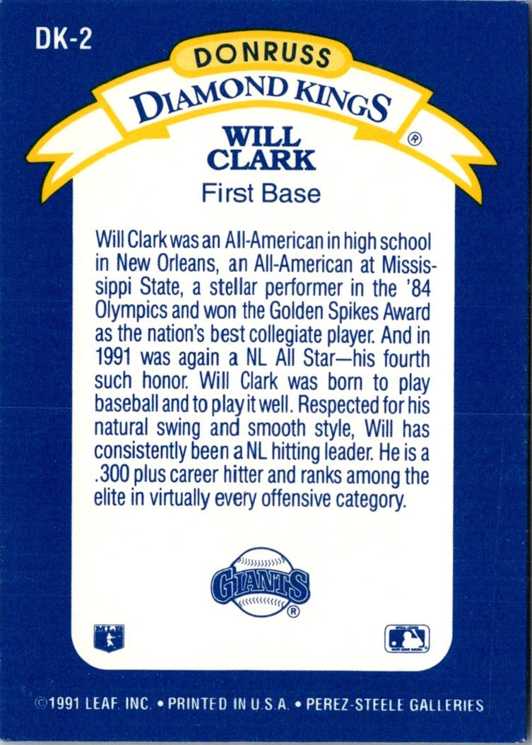 Description: 1992 Donruss Diamond Kings Will Clark #DK-2