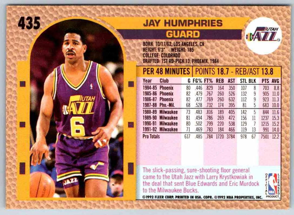 This 1992 Fleer Jay Humphries #435 card is a must-have for any basketball fan! This card features a vivd action photo of Humphries, showcasing the Phoenix Suns guard in mid-air as he shoots for the basket. It also features Humphries' name and team logo, as well as his jersey number. This card is a perfect way to commemorate one of the most memorable players from the 1992 NBA season!