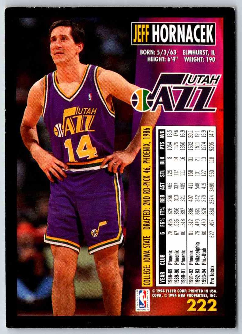 This 1992 Fleer Jeff Hornacek #222 trading card celebrates one of the greats from the 1992 NBA season. With a unique design, this card is a great addition to any basketball fan's collection. Featuring Hornacek in his Utah Jazz uniform, this card captures the Hall of Famer in mid-action as he drives to the basket. On the reverse side, a detailed biography and stat line outlining Hornacek's career accomplishments. This is a must-have card for any Hornacek collector.